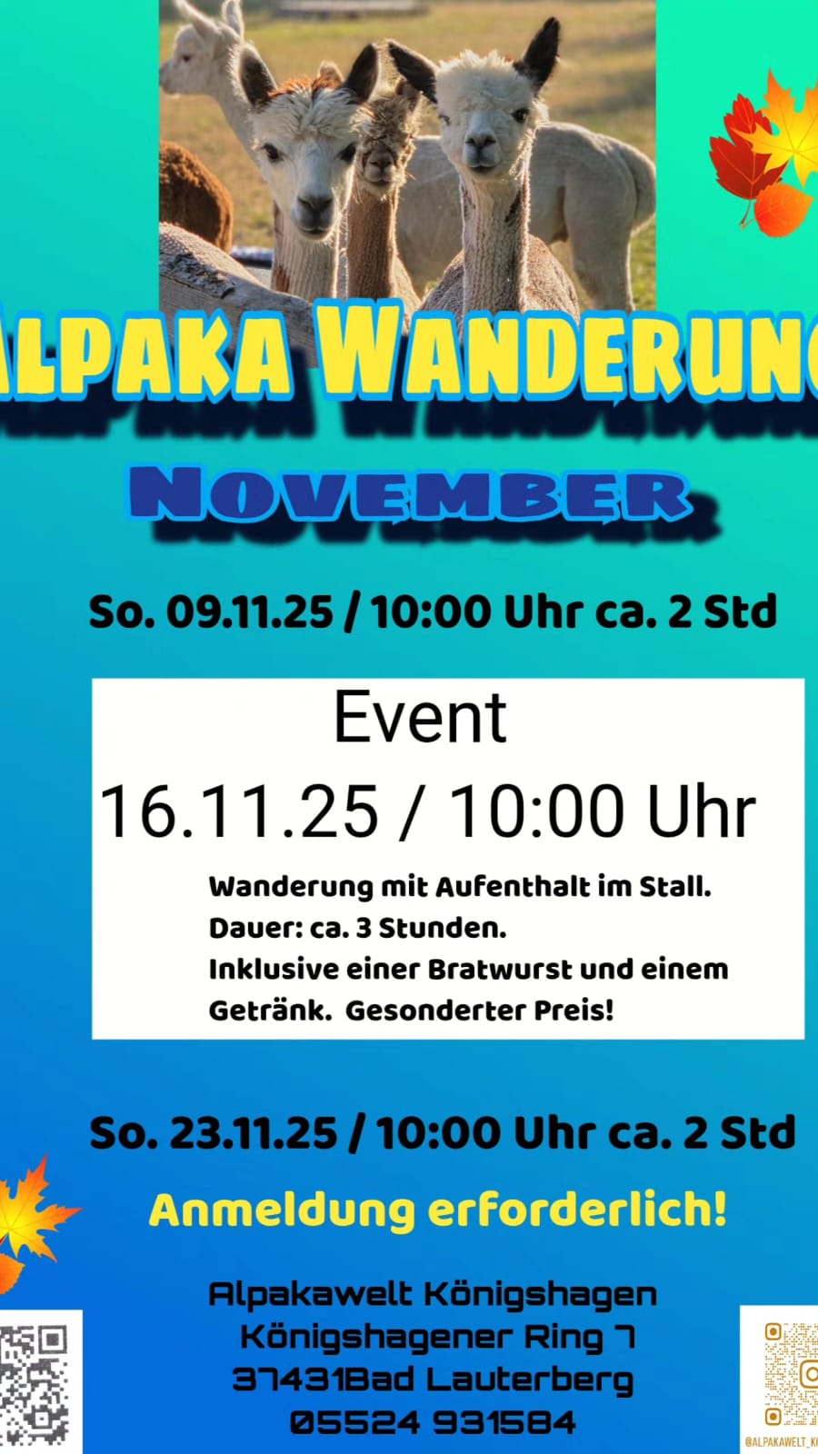 Die Anmeldung findet über uns statt (Alpakawelt- Königshagen) und ist verbindlich. Bitte per Telefon oder Mail.